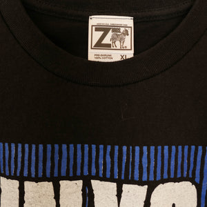 Triple washed and ready for wear. Traditional silk screen on a boxy mid-weight cotton tee. No holes or stains.