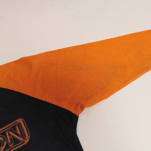Triple washed and ready for wear. Traditional silk screen on a poly-cotton tee. Discoloration marks on the sleeves. In overall good used condition.