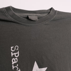 Shirt is super faded, color closer to dark gray. Triple washed and ready for wear. Traditional silk screen on a heavyweight cotton tee. No holes or stains.