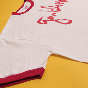 Triple washed and ready for wear. Traditional silk screen on an ultra soft, 100% cotton ringer tee. In excellent used condition. No holes or stains.