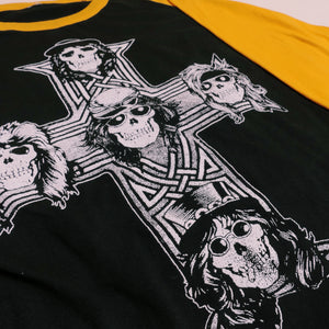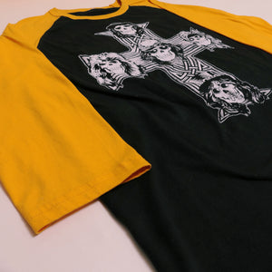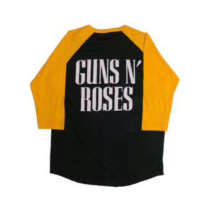 Triple washed and ready for wear. Traditional silk screen on a 100% cotton 3/4 sleeve raglan tee. No holes or rips.